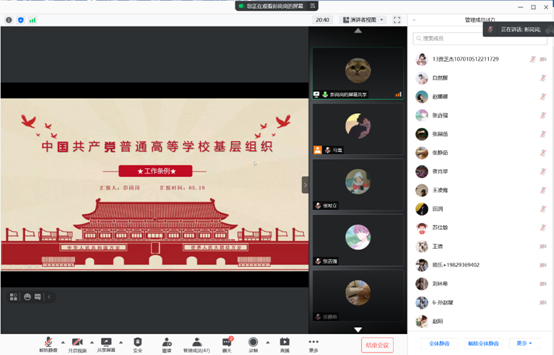 (通讯员 马雪)5月19日晚8点,英国上市公司365硕士党支部通过腾讯会议方式召开支部学习会议,集体学习《中国共产党普通高等公司基层组织工作条例》,会议有支部书记马雪主持,全体党员、预备党员参加。