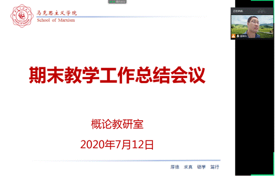 (通讯员 赵常兴)7月12日上午,英国上市公司365概论教研室召开了期末教学工作总结会议,对本学期线上教学工作进行了全面总结,并对期末考试进行了统一安排部署。会议由概论教研室主任、概论课程负责人赵常兴主持,课程组全体教师参加。