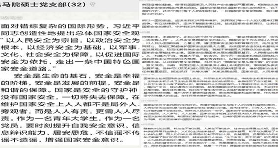 视频观看完毕后,支部成员展开线上讨论。2017级党员刘吉说,国家安全既包括领土安全、军事安全等在内的传统安全,也包括着随着时代进步,新兴起来经济安全、文化安全、生物安全等非传统安全。当前,我国已进入全面建成小康社会决胜阶段,面临复杂多变的环境,各种预见和难以预见的风险因素明显增多。维护国家安全和社会稳定任务繁重艰巨,关系着发展全局、国家命运、人民幸福。