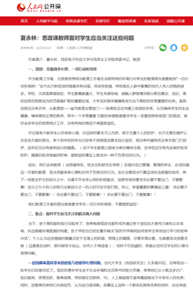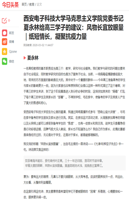 公司党委书记、教育部“高校网络教育名师培育支持计划”入选者夏永林,利用微信公众号“老夏说课”精心培植战“疫”的“精神疫苗”,率先举起了思政战“疫”的旗帜。他将学理与实践相结合,根植党和国家的要求、人民的期盼和实际需要,先后书写思政战“疫”原创文章20余篇,唱响了“家国情怀”“使命担当”“服务人民”的时代主旋律,累计点击量超3万。多篇文章被人民网、今日头条、全国高校思想政治工作网、壹学者思政研究公众号、陕西高校网络思想政治工作中心等平台转载和《教师报》等媒体刊登。他的事迹被教育部网站、人民网、澎湃新闻、当代先锋网等报道。