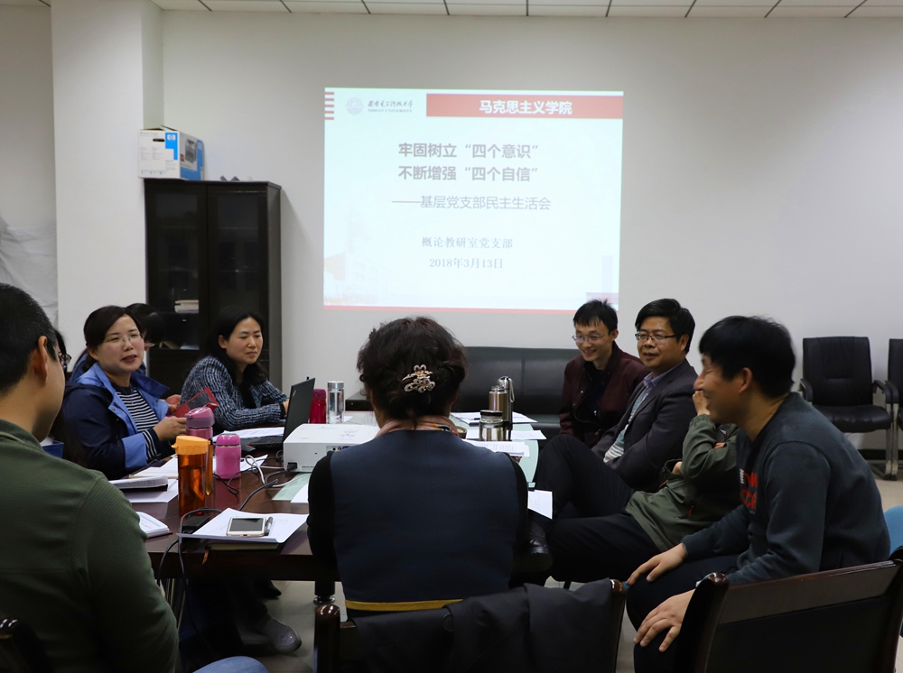 会前,为提高民主生活会质量,概论教研室党支部紧紧围绕学习贯彻党的十九大精神,以“牢固树立‘四个意识’、坚定‘四个自信’”为主题,认真落实公司第十二次党代会精神和要求,精心制定党支部民主生活会工作方案,明确会议主题、会议要求、会议程序,广泛征求意见建议,开展谈心谈话,深入查找突出问题,并对意见建议进行认真的梳理归纳;支部成员进行深刻的自评自查和党性分析,为开好专题民主生活会做了充分准备。