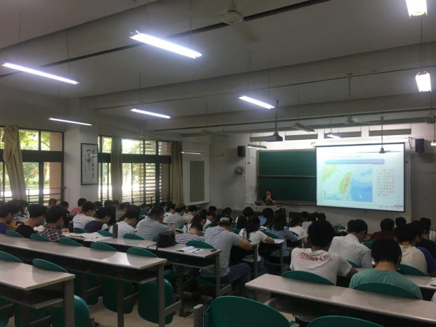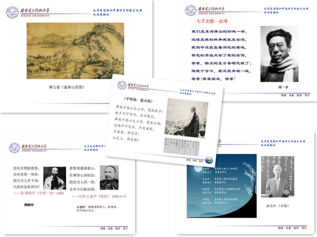 “我们先来看一组资料,共5个片段展示给大家。首先,大家一起看看这一幅黄公望的《富春山居图》,这幅画在清代遭遇火焚断为两截,目前这幅名画分别放在浙江省博物馆和台北故宫博物院,历经几百年的一幅画,何时才能真正合二为一?”随后,闻一多的《七子之歌》、谭嗣同的《有感一章》、于右任的《望大陆》、余光中的《乡愁》等被一一投放在大屏幕上。在带领同学们通过一件件文学、艺术作品体会海峡两岸人民盼望统一的心情之后,陈鹏联开始讲授今天的“毛泽东思想和中国特色社会主义理论体系概论”课程,第18个专题——《历史使命实现祖国完全统一》。