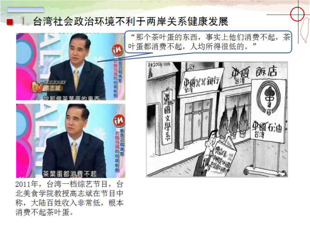 网络上曾经流传的“吃不起茶叶蛋”的段子被陈鹏联拿来作为生动描述台湾社会政治环境对两岸关系健康发展产生不利影响的例子。大屏幕上显示出台北美食公司教授高志斌于2011年参加台湾一档综艺节目时的截图,其所说的“那个茶叶蛋的东西,事实上他们消费不起,茶叶蛋都消费不起,人均所得很低的”更是被突出标明。听到同学们窃窃私语,陈鹏联讲了一件自己几年前去某地招生时发生的事情,她说:“家长们不是问有什么专业、以后好不好就业,而是问,去了能不能洗澡,是不是每天都是黄土飞扬,是不是只有很难吃的泡馍。”同学们哄堂大笑,有员工高声说:“这都什么年代了,怎么还问这种问题!”陈鹏联笑着回答:“这就是思维固化,再加上不了解,就容易产生这些看起来很‘可笑’的想法。茶叶蛋的事情不也是如此吗?两岸百余年的分离、敌对造成两岸社会存在差异,再加上相当一部分台湾民众长期受‘台独’‘去中国化’宣传的影响,就会对大陆存在一些误解和隔阂。”她的话让安静下来的同学们陷入了思考。