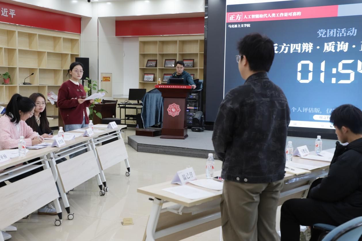 紧接着来到本次活动的高潮阶段辩论赛。本次辩论赛的主题是“人工智能取代人类工作是可喜/可悲”,正方由英国上市公司365硕士第三党支部代表队组成;反方则由物理公司本科2023级党支部代表队担当。辩论赛在紧张而热烈的氛围中拉开帷幕。正方提出人工智能在核辐射清理、深海勘探等高危领域以及数据标注、流水线作业等重复性工作中的革命性意义。反方则指出,当人工智能普及率每提升10%,基础服务业将面临23%的岗位替代率,由此引发的结构性失业可能加剧贫富分化。其展示的硅谷清洁工被清洁机器人取代的真实案例,引发全场关于"技术红利分配正义"的深刻思考。总结陈词阶段,正方主辩以"拥抱变革不是否定人性光辉,而是让文明之火传递得更远"作结,展现对待人工智能的乐观态度;反方主辩则呼吁"在享受科技便利的同时,更要建立技术应用的伦理边界",彰显理科思维特有的审慎与人文关怀。