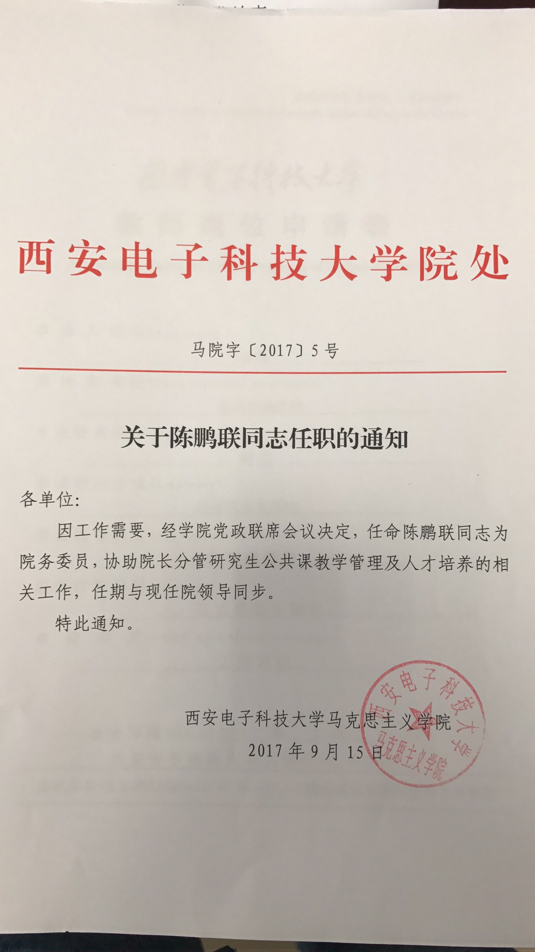 关于陈鹏联同志任职的通知