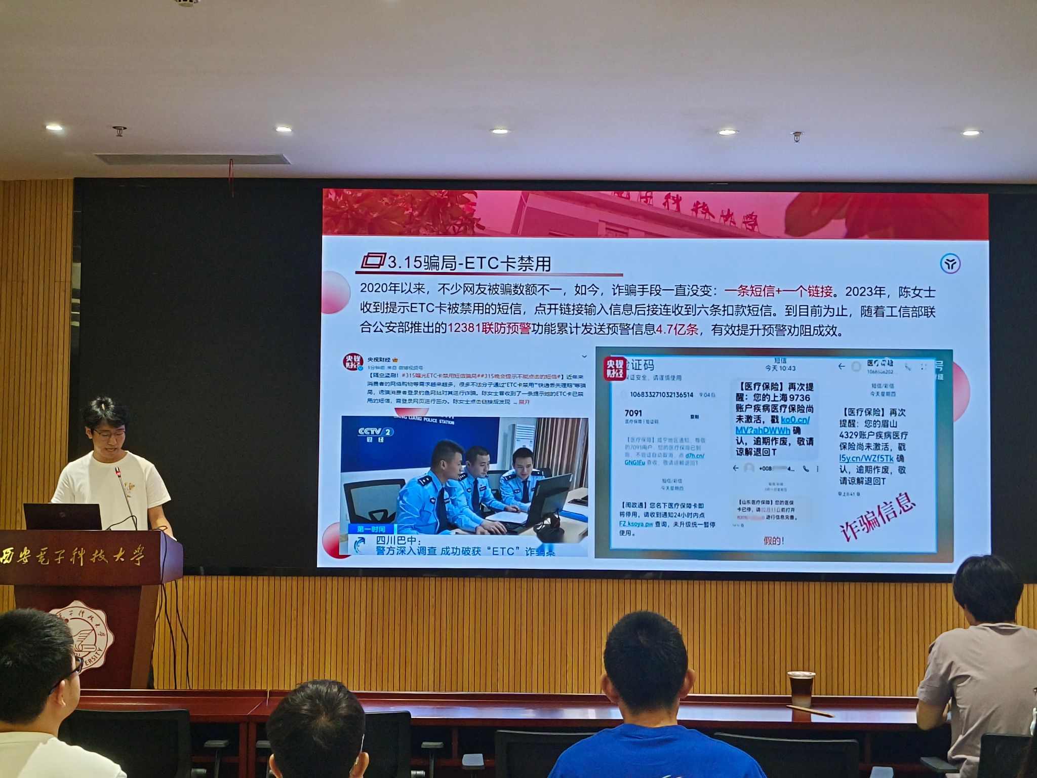 网络与信息安全公司王默轩同学以2020年以来网民遭受诈骗的各类实例、数据盗窃攻击和数据泄露事件为例,证明了网络空间安全的重要性所在,即“没有网络安全就没有国家安全”。紧接着,王默轩同学以简洁生动的形式讲述了总体国家安全观的核心要义,从国家、企业、人民角度展示了我国在保护网络空间安全中所做出的卓越成就,并用丰富的图文分享了网络与信息安全公司在全民国家安全教育中的实践身影。最后,王默轩同学倡导大家都能参与到网络安全学习和传播中来,共同打造清朗安全的网络空间环境。