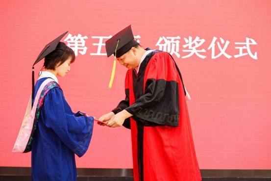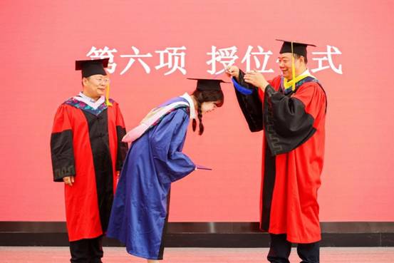随后,公司副经理刘建伟宣读了学位获得者名单,并向同学们顺利完成学业表示热烈祝贺。在授位环节,毕业生们依次登台,杨银堂书记和李刚经理逐一为毕业生颁发证书、拨正流苏,并合影留念。