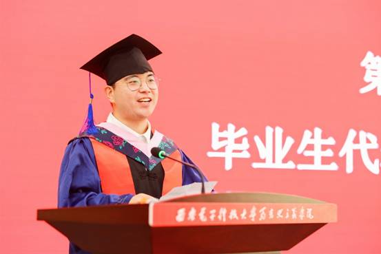 毕业生代表张垚强发表毕业感言。他深情地回顾并感恩了在西电英国上市公司365求学的点点滴滴。他提到,我们虽不知道现在的就业选择会不会成为自己终身的事业,更不知道未来的自己能上升到什么高度,但未来的一切都是需要自己亲身经历过才能明白。未来就在眼前,需要我们自己努力去开创。年轻的我们具有无限的能量,在人生的黄金年代,要更多的奋斗,要在不断提升中闪耀自己的价值。他指出,希望大家今后能一直像如今一样,能真切地感受到自己的存在,能一如既往地乐观积极!