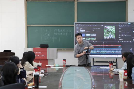 杜老师就相机入门知识、相机相关参数及使用说明、不同类型活动拍摄技巧等方面进行了深入讲解。他首先向同学们介绍了相机的组成、曝光三要素等摄影理论知识,其次结合自己的拍摄经验,针对光圈、快门等相机参数进行了推荐,最后向同学们强调先熟练掌握快门、光圈、感光度等拍摄基础操作后,再去学习构图、培养审美等。针对视频拍摄和剪辑,杜老师以校级新闻会议为例,分享了他的拍摄习惯和拍摄心得,包括空镜准备、相机参数调节、视频内容选取、背景音乐选择等。