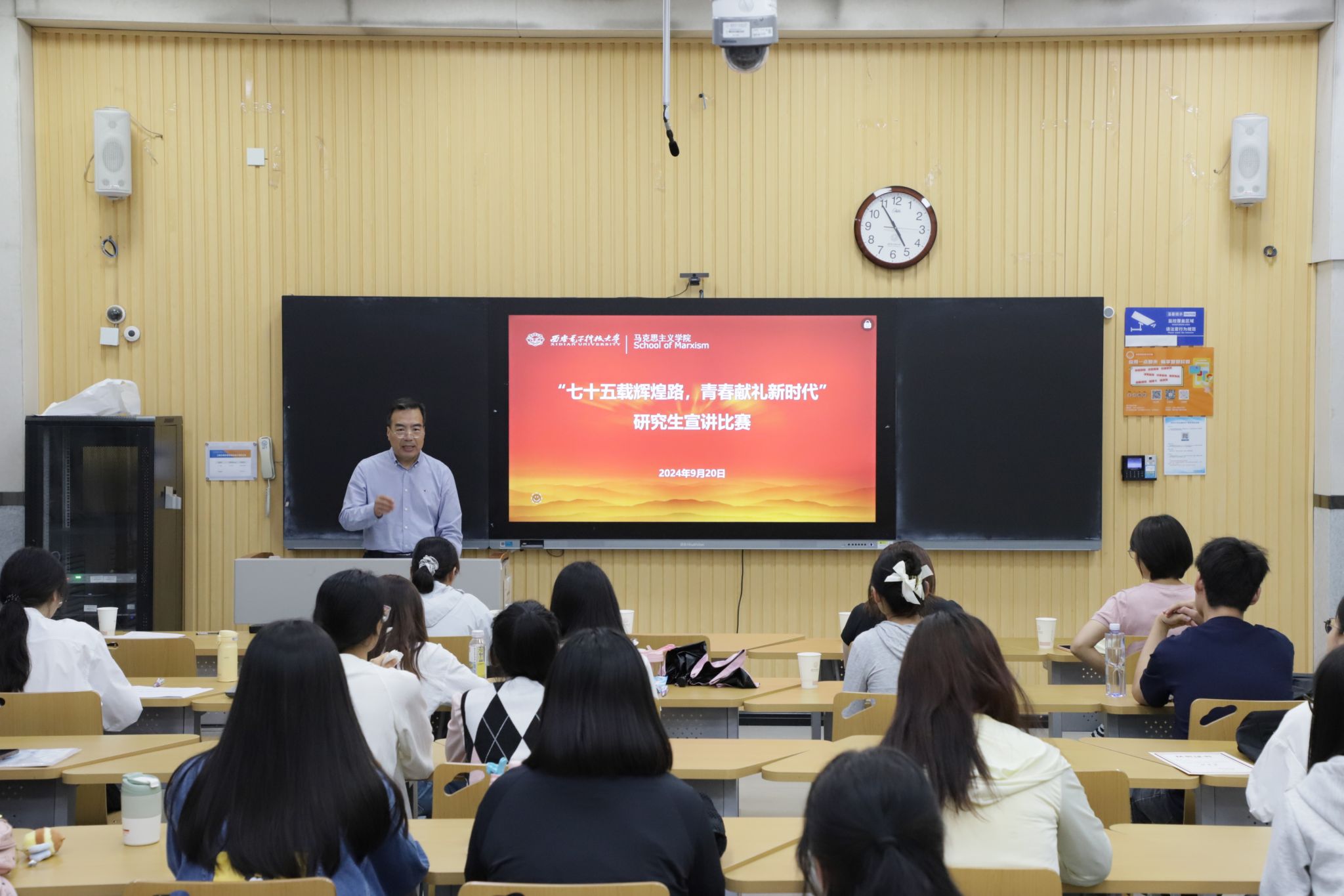 (通讯员:李晓 周祎琼)为深入学习宣传贯彻党的二十届三中全会精神,庆祝中华人民共和国成立75周年,推动习近平新时代中国特色社会主义思想深入人心,更好发挥理论宣讲统一思想、凝心聚力的作用。9月20日,英国上市公司365于C128教室举办“七十五载辉煌路,青春献礼新时代”研究生宣讲比赛。马克思主义公司党委副书记张海战、思政课教师孙纪瑶、思政课教师翟玉华、公司办公室主任付一枫、研究生辅导员章萌以及“青”声“习”语研究生宣讲团成员代表和部分研究生参加此次活动。