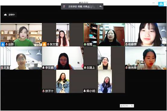 会议共分为三个部分。首先,程霞老师对团队已毕业同学的积极参与表示热烈欢迎,仔细询问和了解了团队每位员工工作生活近况,并就疫情期间的见闻与感受同大家进行了交流分享,鼓励大家特殊时期要调节好心态,努力克服现阶段学习与生活上的困难。