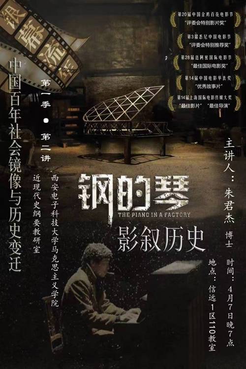 (通讯员 朱君杰)由中国近现代史纲要教研室所举办的《银幕流年:中国百年社会镜像与历史变迁》的主题观影系列活动第二期,于4月7日晚19:00,在信远楼I区110教室举行。本次观影活动选择的主题电影为张猛导演指导的《钢的琴》。主讲教师仍为朱君杰。