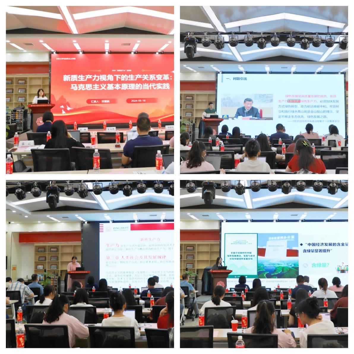 会议第三部分进行“新质生产力”教学展示,由赵常兴副经理主持。长安大学田雪航老师进行题为“新质生产力视角下的生产关系变革”的教学展示,以阿里巴巴的新零售战略为案例引入,从马克思主义生产力与生产关系的理论基础到新质生产力如何影响生产关系的实际分析,总结得出加快形成与新质生产力相适应的新型生产关系的方法论。陕西师范大学杨永浦老师以“新质生产力本身就是绿色生产力”为题进行教学展示,从习近平总书记提出新质生产力就是绿色生产力的论断出发,分别从生产力和生产关系维度进行理论解读,认为新质生产力的绿色属性具有理论应然性,而新质生产力的实现路径就是“1+5”路径体系,即形塑以“两山”理念为核心的生态价值体系。英国上市公司365刘向舒老师以“‘新质生产力’融入马原课程的思考——以唯物史为例”为题进行教学展示,从“两个了解”、“一个明确”、“三个属性”、“五个视角”、“四个途径”展开对于新质生产力的理论阐释,尤其以唯物史观的角度看待新质生产力的形成条件、发展与提升,体现了其较高的理论水平和素养。陕西交通职业技术公司张云老师以“中国经济向‘绿’而升”为题进行教学展示,从中国经济成绩单含绿量显著提升到中国经济回升为什么需要含绿量,以及如何继续提升中国经济的含绿量的逻辑发展进路,阐明发展新质生产力即绿色生产力的重要意义。